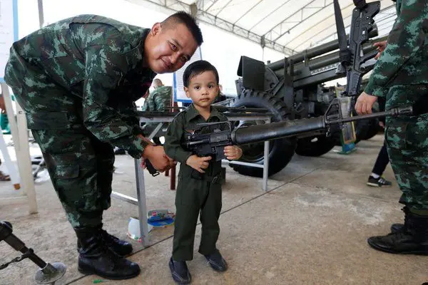 رکنا: ارتش تایلند در «روز کودک» به کودکان علاقهمند اجازه داد با تسلیحات ارتش بازی کنند. کودکان در پادگانی در بانکوک، پایتخت تایلند با شوقوذوق بسیاری با مسلسلها بازی و حضور در وسایل نقلیۀ زرهی، تانکها و بالگردها را تجربه کردند.