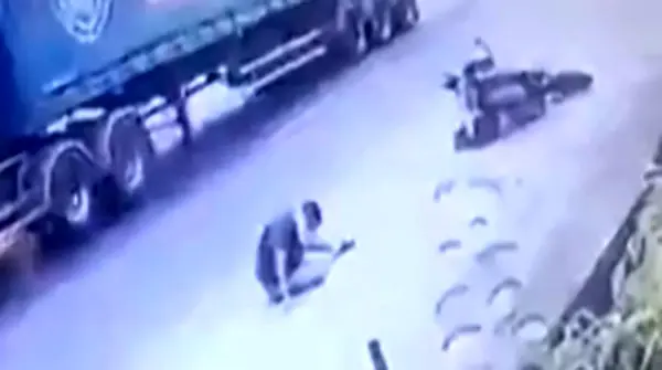زنده ماندن موتور سوار پس از برخورد با چرخهای تریلی+فیلم