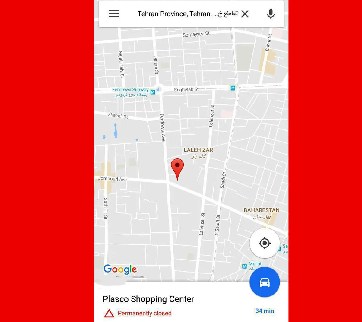 رکنا: گوگل مپ نام پلاسکو را حذف کرد.