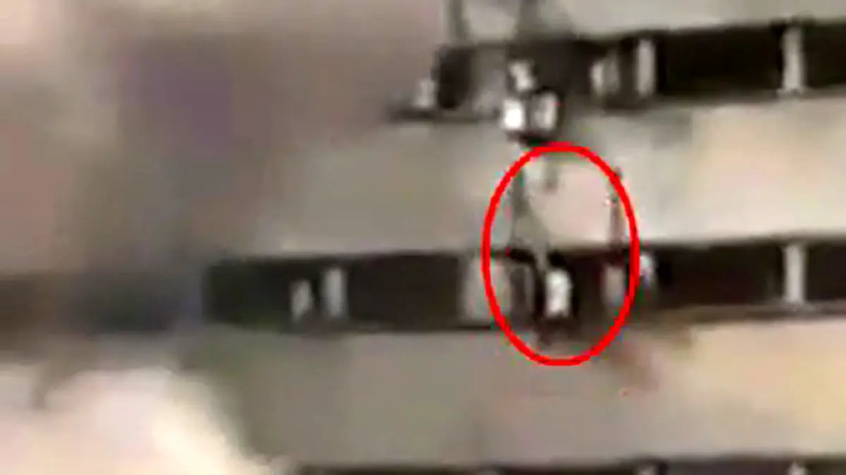 رکنا: فیلمی که در همان ساعات اولیه حادثه پخش شد، شخصی را نشان می دهد که در حین ریزش ساختمان از پنجره طبقه دهم آویزان است و در همان حالت با ساختمان ریزش می کند.