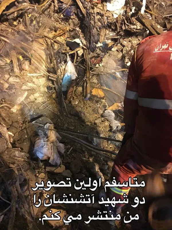 رکنا: گیل آبادی، رئیس مرکز اطلاع رسانی و سخنگوی شهرداری تهران نخستن عکس از محل کشف پیکر دو شهید را منتشر کرد. وی تنها یک جمله روی عکس نوشت: "متاسفم اولین تصویر دو شهید آتشنشان را من منتشر می کنم"