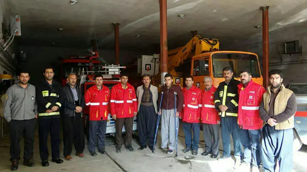 رکنا: سرباز مریوانی که مدتی پیش یک پای خود را هنگام نجات یک توله سگ از دست داد، با حضور در ایستگاه آتشنشانی به قربانیان حادثه پلاسکو ادای احترام کرد.