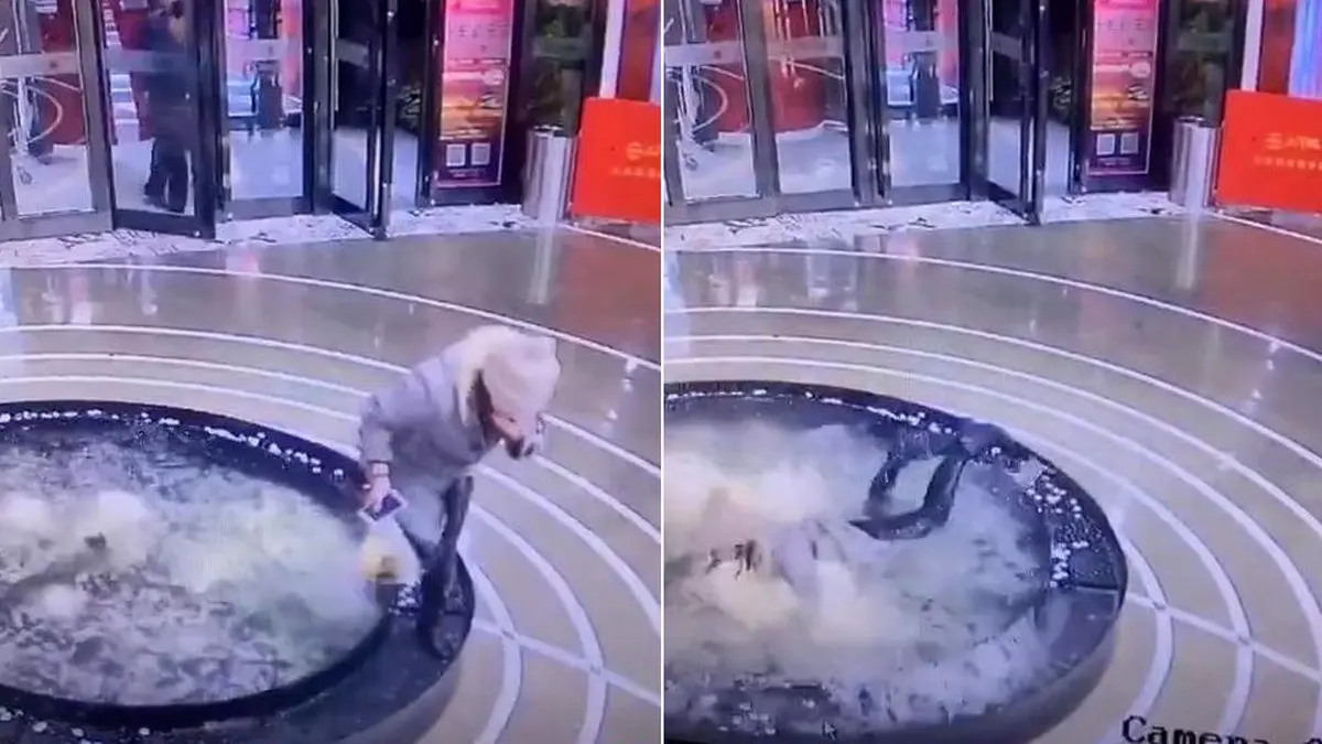رکنا: این مشتری حواس پرت که با تلفن همراهش مشغول بود متوجه حوض بزرگ مرکز خرید نشد.