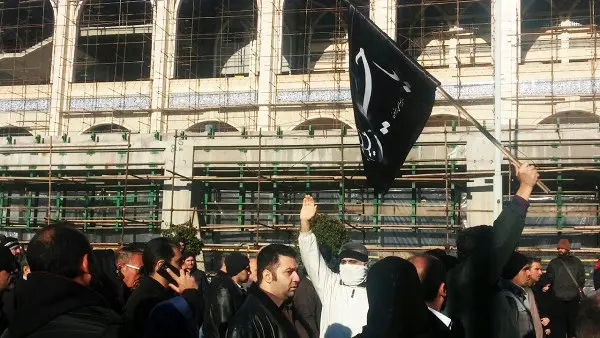 هیئتهای عزاداری با علم کردن پرچم یاحسین (ع) به مراسم بدرقه شهدای آتش نشان حادثه Incident پلاسکو آمدند.