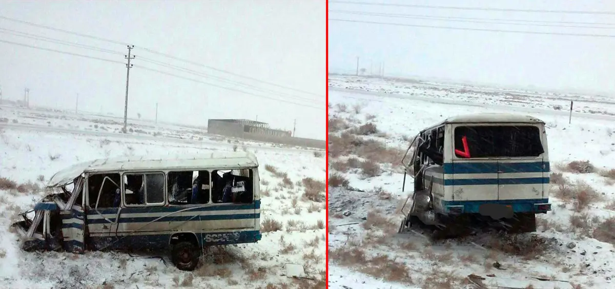 واژگونی مینی بوس در جاده برفی+ تصاویر
