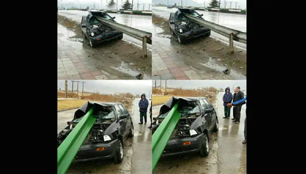 رکنا: گارد ریل از وسط پراید در کرمانشاه گذشت و آن را نصف کرد.