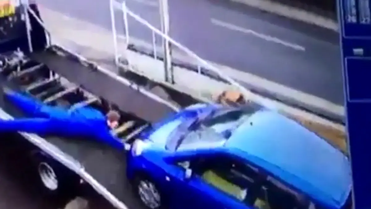 تلاش های بی فایده مکانیک بیچاره برای جلوگیری از سقوط خودرو از روی یدک کش +فیلم