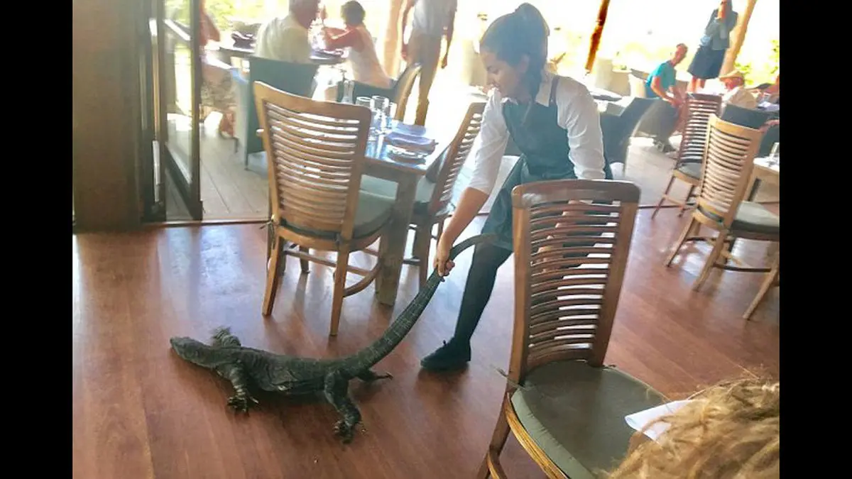 این پیشخدمت اهل فرانسه که در یک رستوران استرالیایی کار می کند حسابی در فضای مجازی مشهور شده است. سامیه لیلا 25 ساله گفت"در ابتدا فکر کردم این حیوان که فقط دمش را میدیدم، سگ است. ولی وقتی حیوان را بیرون کشیدم دیدم با سوسماری غولپیکر که برای غذا خوردن به زیر میز نگهداری مواد غذایی رفته بود طرف هستم. حیوان را بر روی زمین تا بیرون از مغازه کشیدم تا به مشتریان صدمهای نزند"