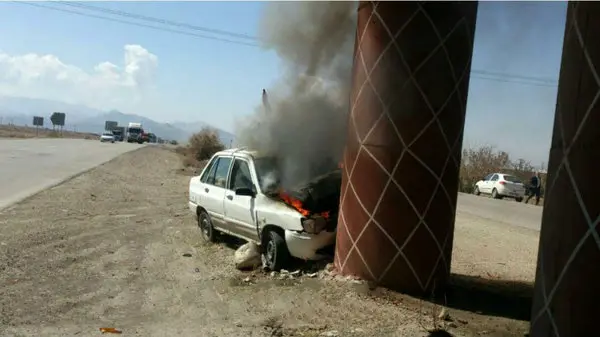 عکس جالب از آتش گرفتن پراید در تصادف با ستون پل روگذر+عکس