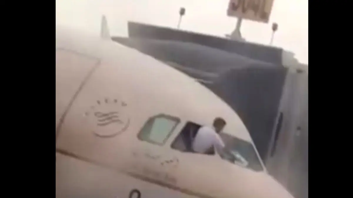 گفته می شود پس از طوفان گرد و خاکی که اخیرا در ریاض برپا شد خلبان مذکور برای آماده سازی هواپیما جهت پرواز، اقدام به تمیز کردن شیشه جلوی آن نموده است.