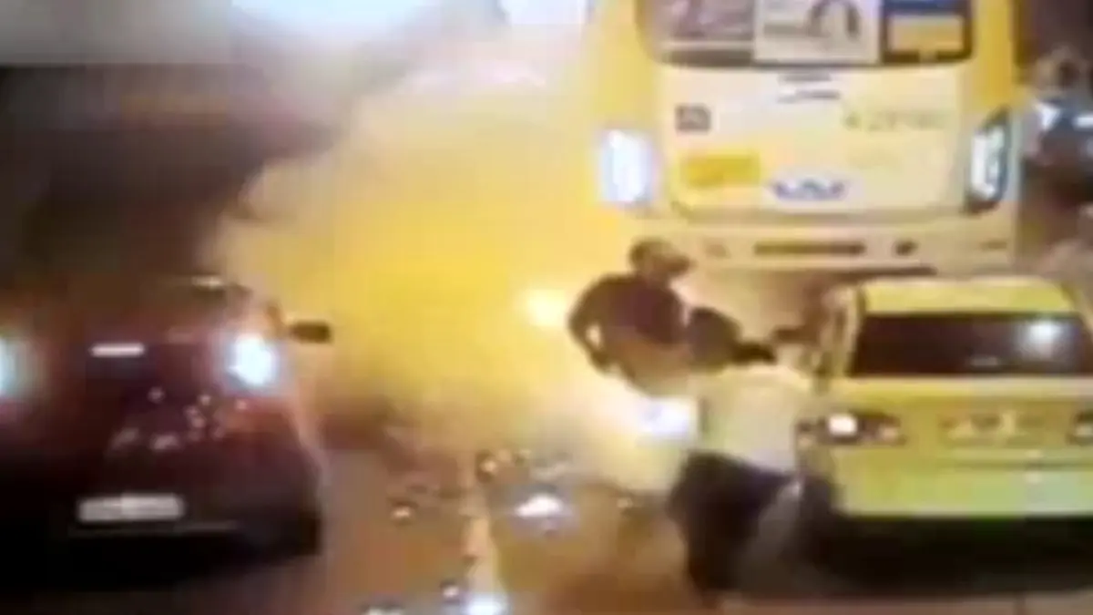 فیلم لحظه آتش گرفتن موتورسواری که بین خودروها می دوید