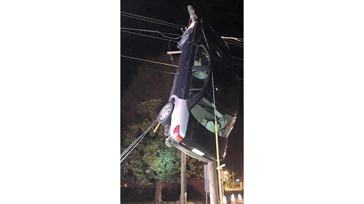 راننده زن خودروی سواری را به پرواز در آورد! / ماشین روی دکل برق گیر کرده بود+عکس