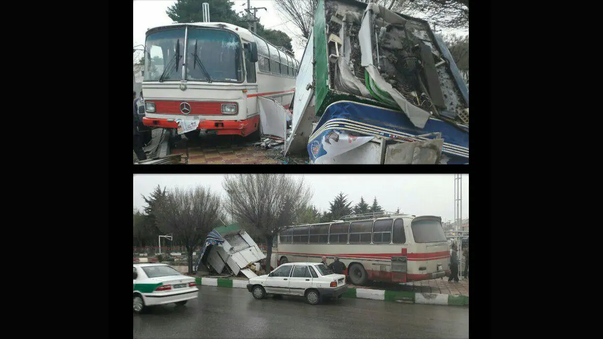 رکنا: اتوبوس بنز در کرمانشاه وارد دکه مطبوعاتی شد.