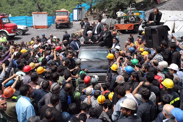 حسن روحانی پس از این سخنرانی، زمانی که قصد ترک محل حادثه را داشت، با اعتراض انبوه کارگرانی روبهرو شد که هر کدام از آنها دل پردردی داشتند. در این میان یکی ازکارگران رو به وی گفت: آقای رئیسجمهور به اینجا خوش آمدید اما فایدهای ندارد. ما 22سال در این معدن کار میکنیم اما شما نمیدانید معدنکار یعنی چی. 40نفر را از دست دادیم. 170بچه بیپدر شدند. 40زن بیوه شدند. چرا ایمنی ندارد اینجا.