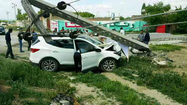 رکنا: بر اثر تصادف سانتافه با تیر چراغ برق درجاده سلماس، روستای چونقرالو، تیر چراغ برق شکسته و روی خودروی سانتافه افتاده و صدمه شدیدی دیده است.