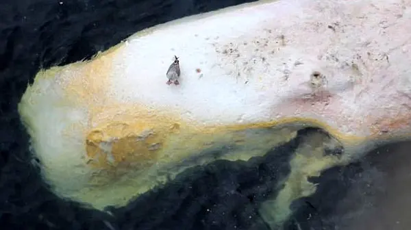 نهنگ پس از تقلای زیاد مرده و یک پنگوئن نیز روی جنازه اش نشسته است.