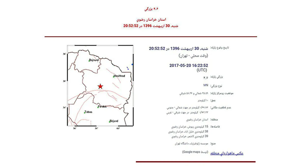 رکنا: دقایقی پیش زلزله ای به بزرگی ۴.۶ ریشتر با عمق ۱۰ کیلومتر زمین خراسان رضوی را لرزاند
