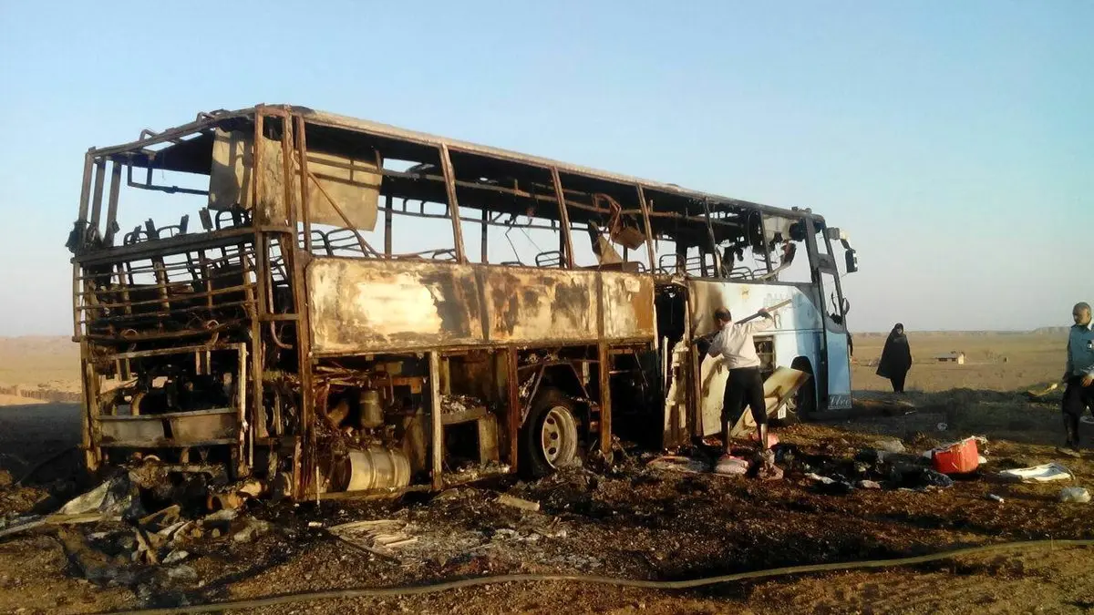 اتوبوس خارجی ها در جاده گناباد در آتش سوخت اما خون از دماغ هیچ کس نیامد! + عکس