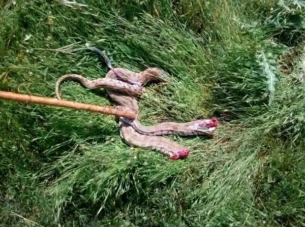 رکنا: افعی چهار متری که در بدره توسط دو سگ شکار شد، با نیش خود هر دو سگ را از پا درآورد.