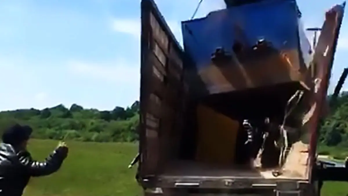 این چنین به نظر می رسد که این کانتینر دقیقا روی سر این مرد که در لحظه حادثه در کامیون حضور داشته فرود آمده باشد اما این کانتینر در فاصله میلیمتری این مرد سقوط کرده و وی بطور معجزه آسایی از این حادثه وحشتناک جان سالم بدر می برد.
