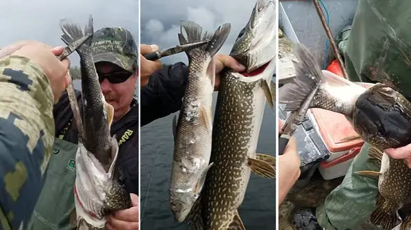 رکنا: صیادان کانادایی موفق به شکار ماهی بزرگی شدند که از درون دهانش یک ماهی دیگر بیرون زده بود.