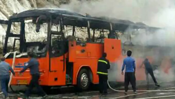اتوبوس مسافربری شیراز در محاصره شعله های آتش + فیلم و عکس