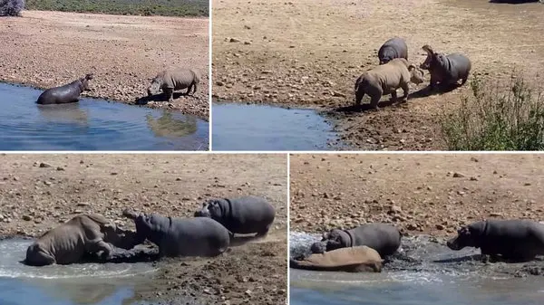 رکنا: فیلم مبارزه دیدنی شگفت آور حمله یک اسب آبی عصبانی به کرگدنی که وارد برکه خصوصی شان شده یکی از پربازدید کننده ترین فیلم های یوتیوپ شد.