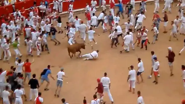 رکنا: جمعیت پر تعداد حاضر در زمین گاوبازی سن فرامین با یک گاو وحشی دست و پنجه نرم کردند.