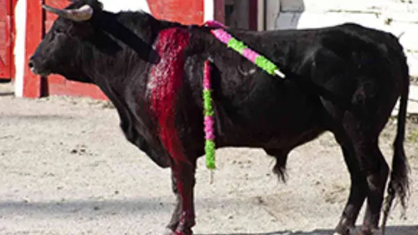 رکنا: دختر بچهای که به «گاوبازی» مشغول است، از این کار جان سالم به در برده و گاو را نبر خسته میکند.