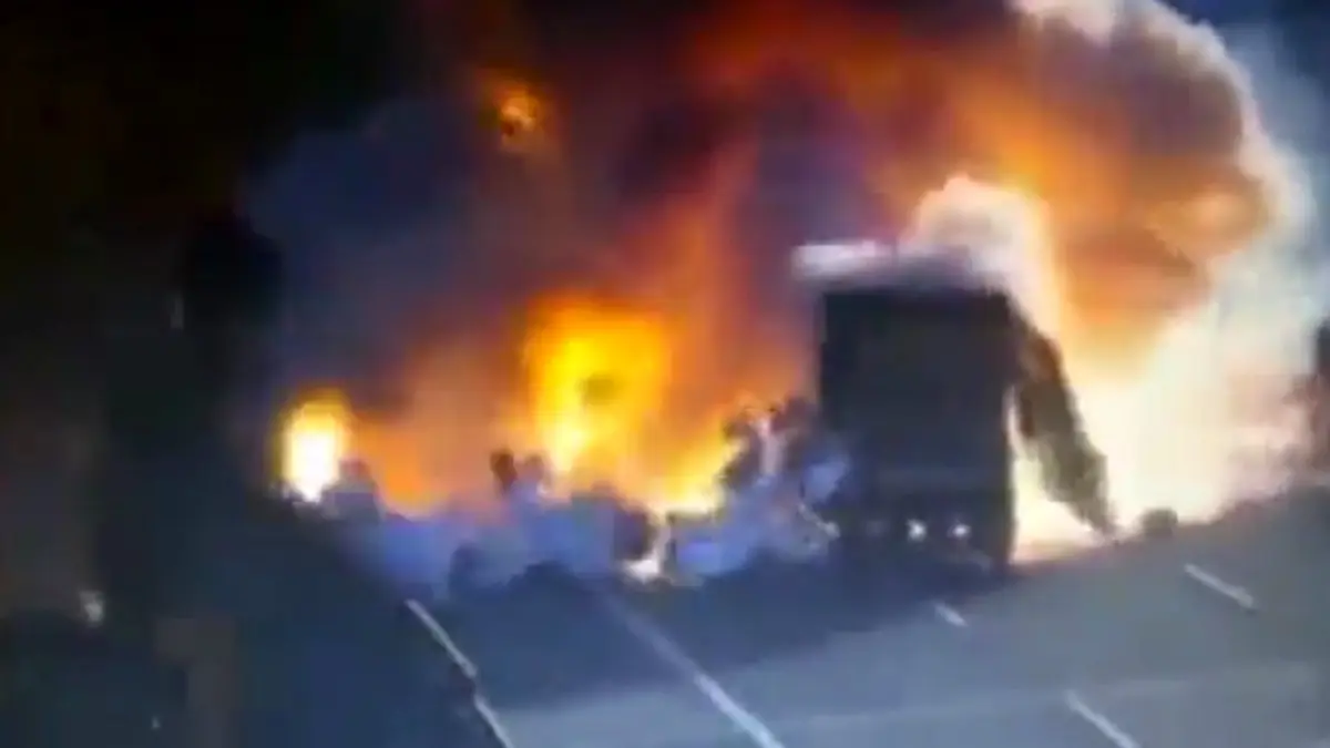 رکنا: تصادف دو کامیون در اتوبان منجر به انفجار هر دو خودرو شد.
