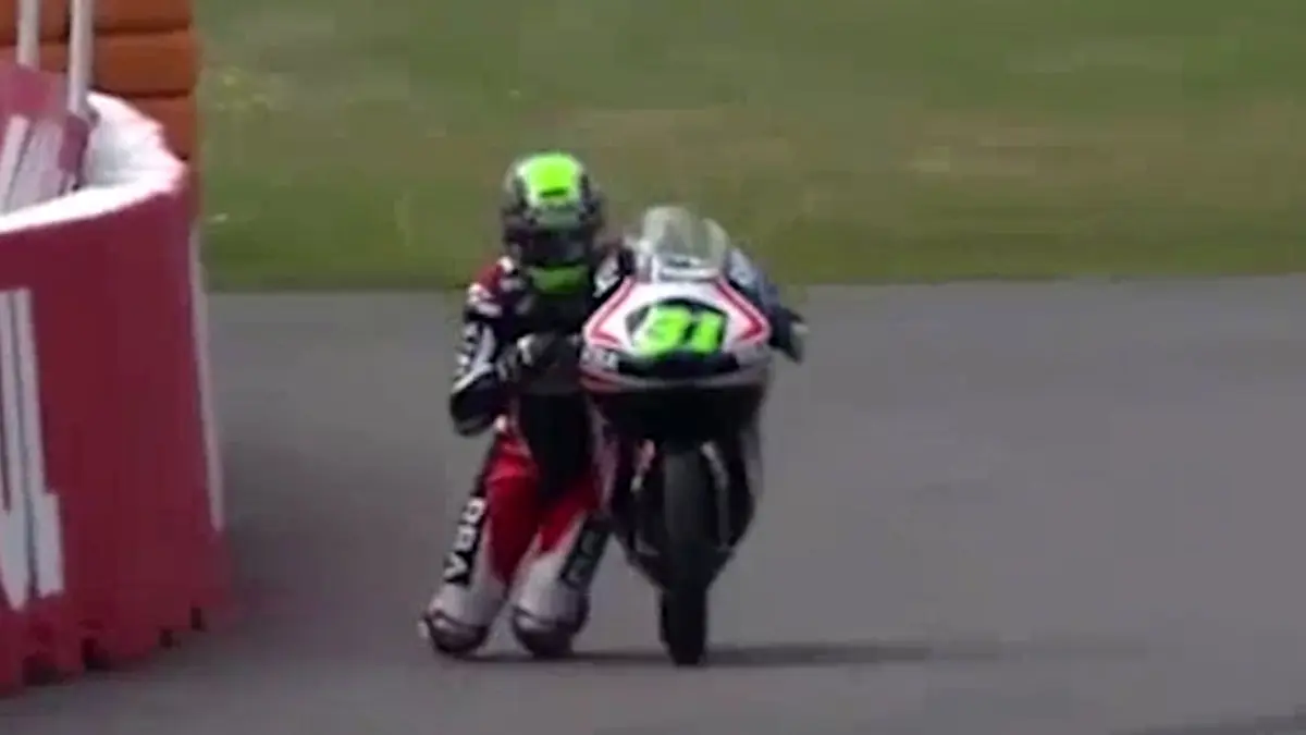در میان مسابقه می بینید که موتور سوار از مسیر خارج می شود و خود نیز از موتور پیاده می شود اما اول با پا و سپس با زانو تعادل موتور را حفظ کرده و از مهلکه جان سالم به در می برد.برای ورود به کانال تلگرام ما کلیک کنید.
