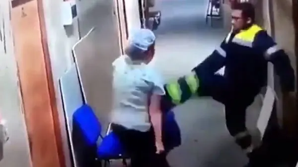 در این ویدئو دیده می شود که چطور بهیار به سمت پرستار هجوم برده و با لگد به شکم این پرستار باردار ضربه می زند و سعی می کند موهایش را بکشد.