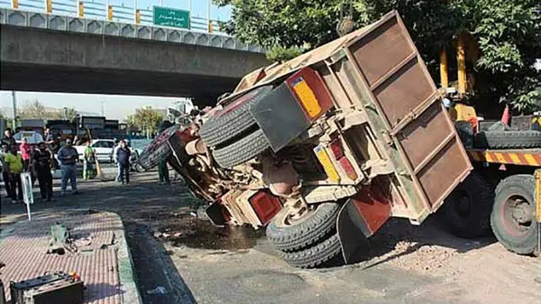واژگونی کامیون حامل سنگ در خیابان استخر +عکس