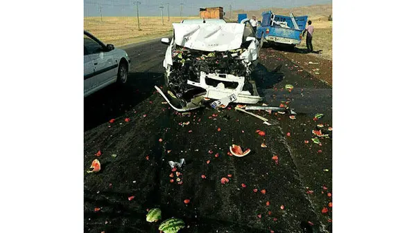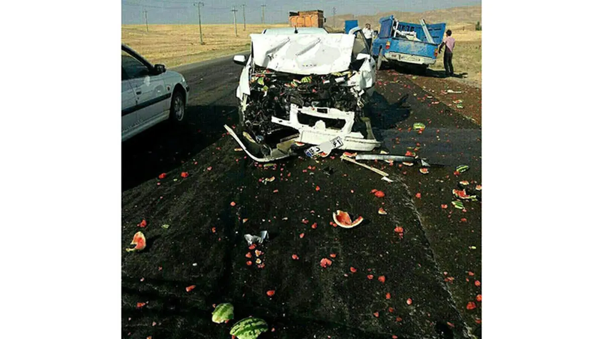 رکنا: برخورد یک دستگاه خودروی سواری سمند با یک وانت که بار هندوانه داشت جاده را هندوانه ای کرد!