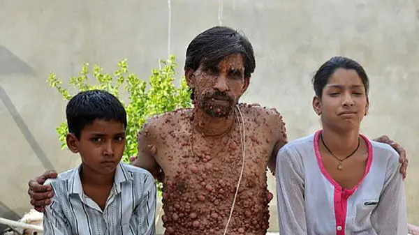یک مرد هندی 46 ساله به نام سوریندر شارما دچار بیماری ژنتیکی است که از پدر خود به ارث برده است، بیماری به نام نوروفیبروماتوز که از 20 سالگی گریبان او را گرفت و اکنون به خاطر آن تمام بدنش از تومورهای مشمئز کننده ای پوشیده شده است.