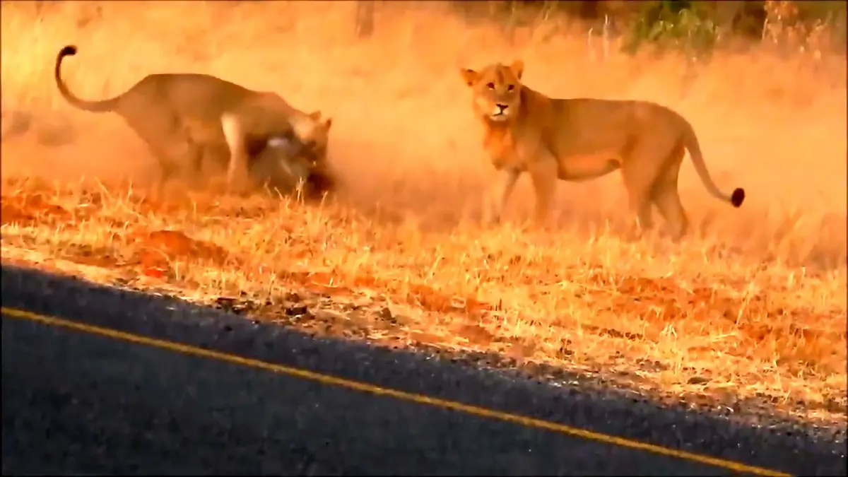 شکار یک گراز توسط شیرها کنار جاده آسفالته + فیلم بسیار زیبا