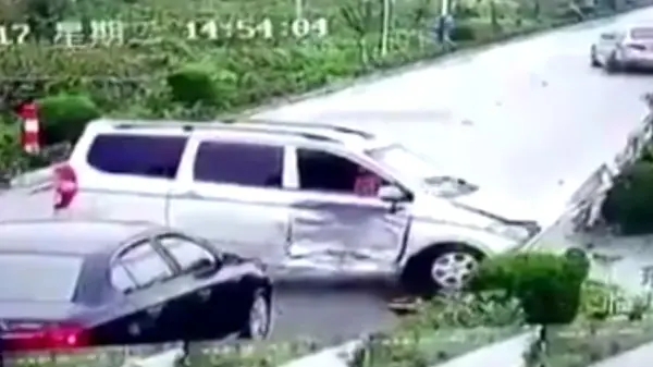 راننده یک دستگاه ون هنگام عبور از یک خیابان در شهر «گوانگجو» چین پس از برخورد به خودرویی دیگر، نتوانست کنترل ماشین را حفظ کند و با سرعت زیاد به یک موتورسیکلت برخورد کرد.