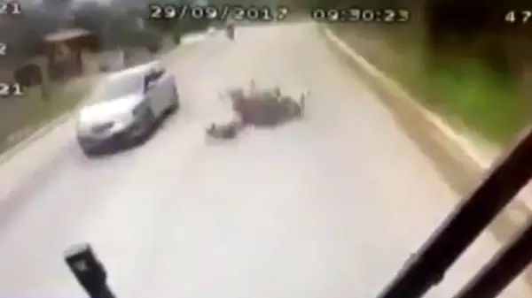یک دستگاه موتورسیکلت، پشت سر یک خودرو در جادهای واقع در کشور روسیه مشغول حرکت بود که به دلیل توقف ناگهانی خودرو، راکب موتور روی زمین افتاد.
