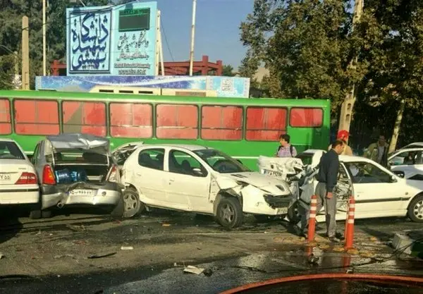 فیلم تصادف زنجیرهای ۱۱ خودرو در مقابل دانشگاه شهید بهشتی + عکس