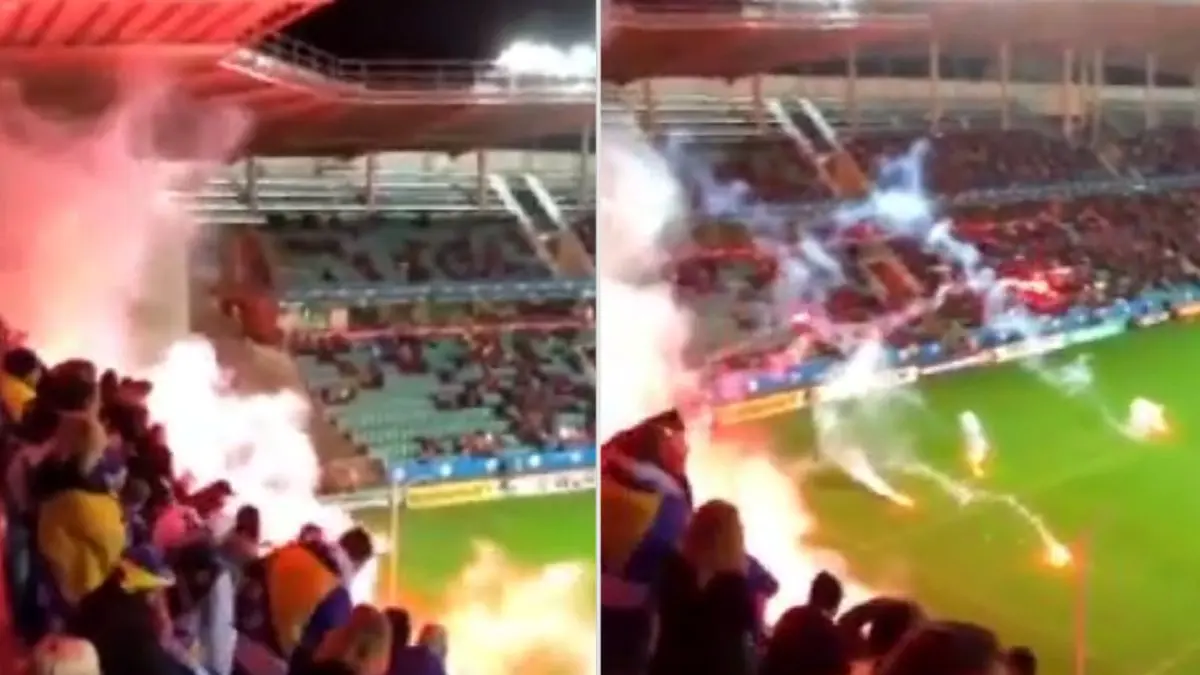 پرتاب خطرناک مواد آتشزا به زمین فوتبال + فیلم