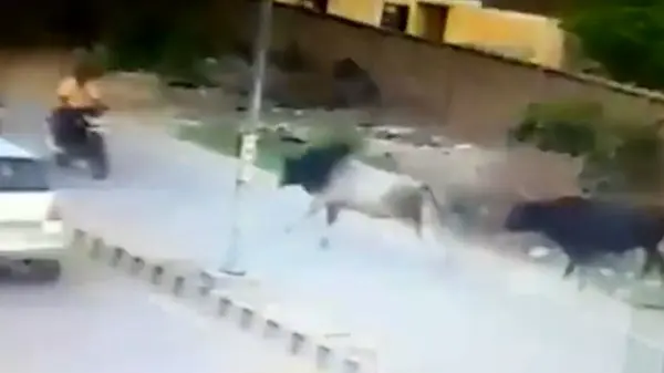 رکنا: یک گاو وحشی به طرز عجیبی به یک موتورسوار یورش برد.