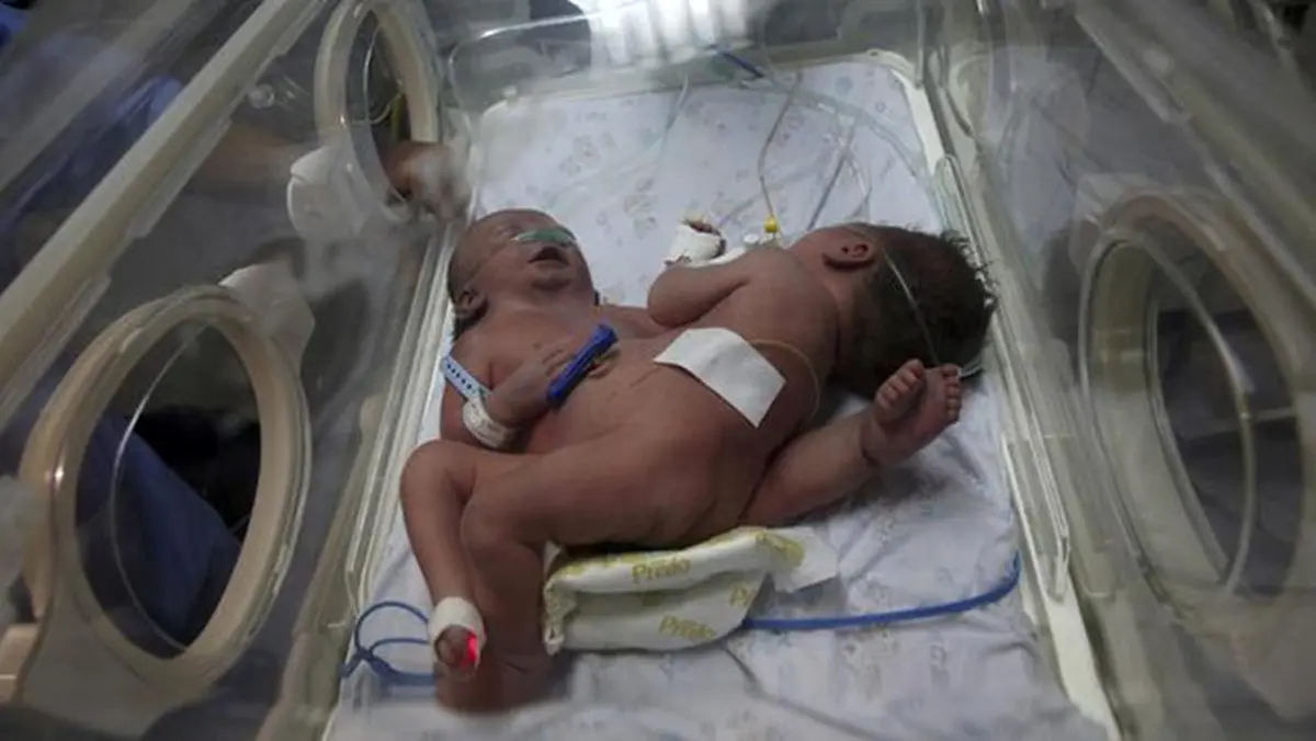 رکنا: در یکی از بیمارستانهای غزه دو نوزاد دختر متولد شدند که از ناحیه شکم و لگن به هم چسبیده بودند.