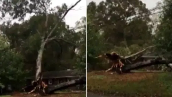 وقوع طوفان در جنگلهای ایالت کارولینای شمالی (آمریکا) باعث شد یکی درخت تنومد روی یک خانه جنگلی بیفتد.