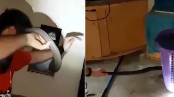 رکنا: شجاعت پسری را ببینید که در عرض چند ثانیه و با چند ابزار ساده، ماری بزرگ را از سوراخش بیرون میکشد.