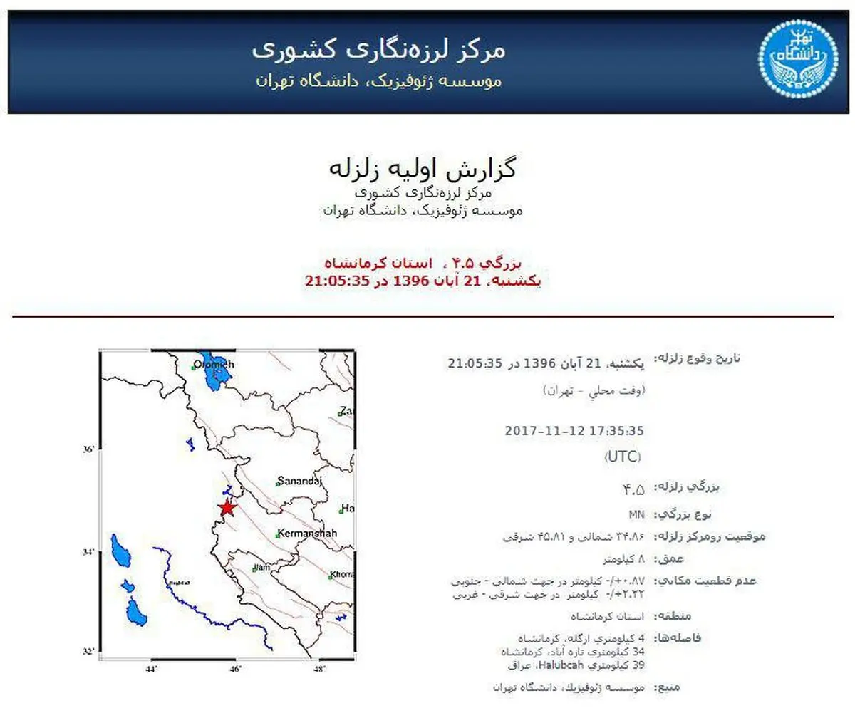 رکنا: زمینلرزهای به بزرگی ۴.۵ ریشتر در عمق ۸ کیلومتری زمین منطقه 'ازگله' در کرمانشاه را لرزاند.