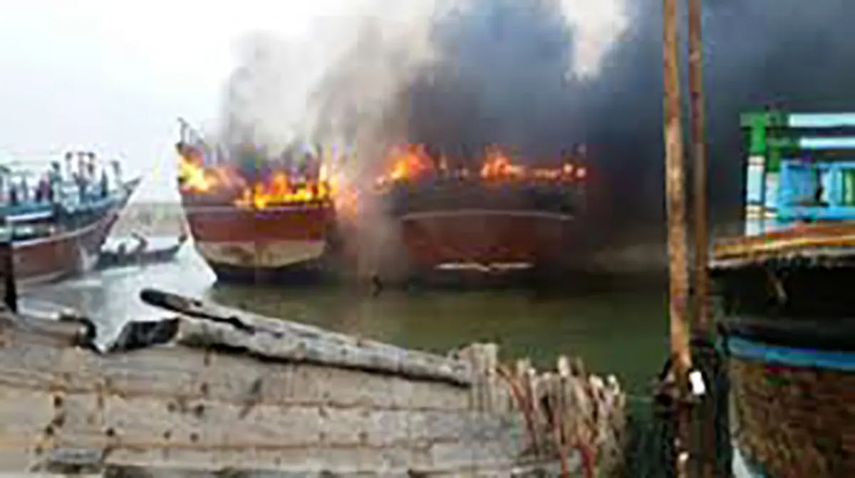 6 ملوان در محاصره لنج آتش گرفته ساحل بندرلنگه + عکس