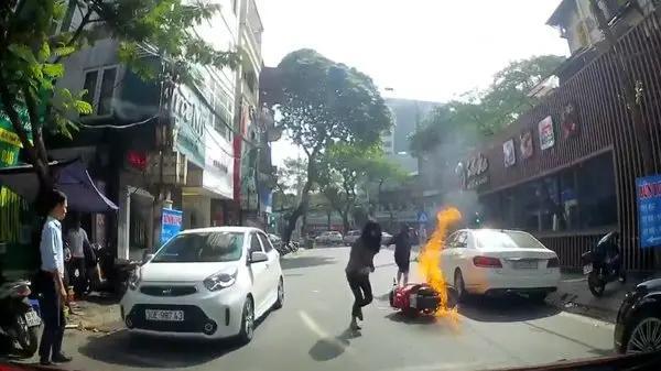 دو زن ویتنامی که سوار بر موتورسیکلتی مشغول حرکت بودند، با آتش گرفتن ناگهانی موتور به سرعت از روی آن پیاده شدند. فروشندگانی که این حادثه Incident را دیدند با سطلی از آب برای خاموش کردن آتش، به سمت موتورسیکلت رفتند.برای ورود به کانال تلگرام ما کلیک کنید.