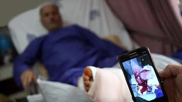 عکس های توی گوشی پشت سرهم ورق می خورند؛ پای راست آقا حشمت جلوی چشمم است، از وقتی که از زیر آوار درآمده ، همانطور زخمی و خون آلود و تکه پاره. تا بعد از عمل. همین حالا که پر از بخیه است؛ جایی نزدیک قوزک ، زیر بخیه ها سیاه شده، سیاه سیاه.»