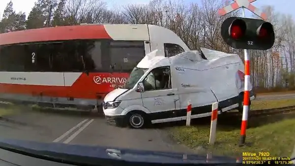 راننده یک خودرو در لهستان بدون توجه به قطار، وارد مسیر تقاطع ریلی شد و به طرز بسیار وحشتناکی با قطار تصادف Crash کرد.