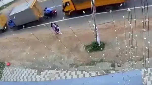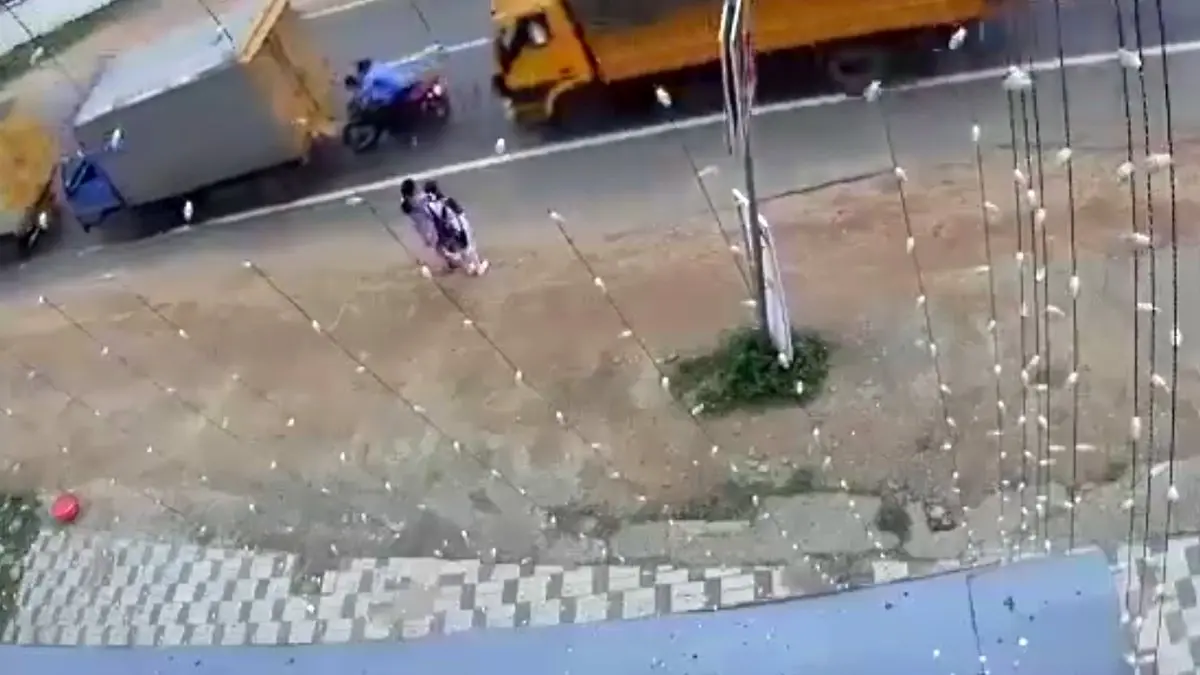 یک موتورسیکلت با دو سرنشین در خیابانی در هند مشغول به حرکت بودند که یک کامیون با سرعت زیاد به موتور برخورد و موتورسواران را بین دو کامیون له کرد.